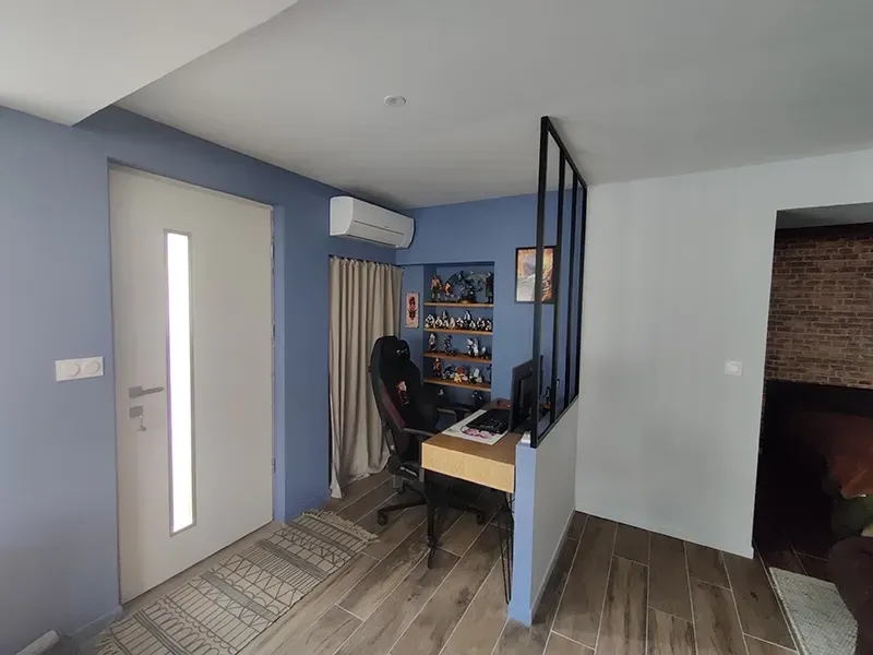 Dans ce projet, l’objectif était de délimiter l’entrée en intégrant un bureau fonctionnel, sans alourdir l’espace.
