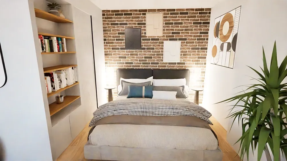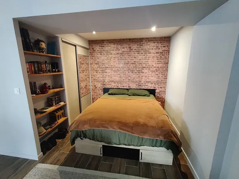 Pour apporter une touche industrielle à la chambre, nous avons opté pour un papier peint effet mur en brique, qui ajoute à la fois du caractère et de la profondeur à cette petite pièce.