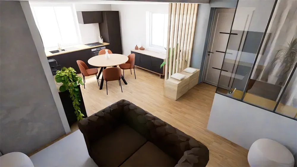 Les vues 3D permettent de visualiser le projet tel qu’il prendra forme, dans son volume réel. Elles offrent une projection fidèle de l’aménagement final : circulation, choix des matériaux, équilibre des couleurs, mobilier et ambiance générale. C’est un outil essentiel pour valider chaque intention avant les travaux et avancer en toute confiance.